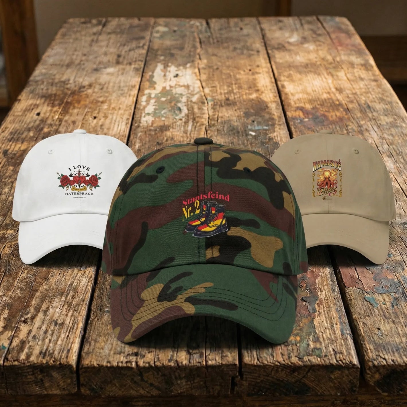 CAPSCaps mit Motiven zwischen klar und kalkuliert daneben.